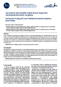 Rozsdamentes acélok hegesztésekor az ipari alkalmazásokban egyre elterjedtebb a lézeres hegesztés. Költségcsökkentés érdekében a hengerelt rozsdamentes idomacélokat ki lehet váltani lézerhegesztett szerkezetekkel. Kutatásunkban 1.4301 ausztenites korrózióálló acélból lézeresen hegesztett T kötések korróziós tulajdonságait vizsgáltuk. A hegesztett kötések egy-, illetve kétoldali sarokvarratokkal készültek, eltérő haladási sebesség- és teljesítménykombinációkkal. Az elektrokémiai korróziós méréseket 3,5%-os NaCl-oldatban végeztük, sztenderd, háromelektródos korróziós cellában.