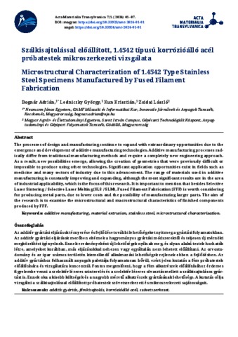 Bognár, Adrián and Ledniczky, György and Kun, Krisztián and Zsidai, László (2024) Szálkisajtolással előállított, 1.4542 típusú korrózióálló acél próbatestek mikroszerkezeti vizsgálata. ACTA MATERIALIA TRANSYLVANICA (HU), 7 (1). pp. 1-7. ISSN 2601-1883