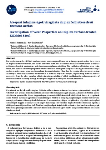 Kutatásunk során háromféle duplex felületkezelésen átesett, valamint kezeletlen, referenciaként szolgáló,42CrMo4 acél próbatesteket hasonlítottunk össze felületi tulajdonságok alapján. A kezelések felületi polírozás, kémiai passziválás, illetve hagyományos plazmanitridálás kombinációiból álltak össze. A vizsgálatoksorán felületi súrlódási együttható, kopásállóság és felületi keménység tulajdonságok mérése történt valamennyi próbatestre, illetve pásztázó elektron- és sztereomikroszkópos vizsgálatokat végeztünk. A vizsgálatieredmények alapján bebizonyosodott, hogy valamennyi, eltérő módon duplex felületkezelt mintán egyedi, atöbbi próbatesttől jelentősen eltérő felületi tulajdonságok alakultak ki, melyek az iparban használt anyagokfelületi tulajdonságainak széles körben való módosítási lehetőségét vetik fel a duplex felületkezelések célzottalkalmazásával.