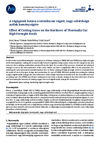 Ebben a munkában XAR® 400 és S960Q típusú nagy szilárdságú acélok lángvágásának következményeitszemléltettük. A lángvágás során a helyileg gyulladási hőmérsékletre hevített fém az oxigénsugárban elég, ésa keletkező égésterméket a vágási résből eltávolítja. A folyamat eredményeképpen az acél szerkezetében kémiai és fizikai változások következnek be, amelyek jelentős hatással lehetnek annak tulajdonságaira és szerkezetére. A nagy szilárdságú acélok termikus vágása szerkezeti átalakulásainak vizsgálata elengedhetetlena megfelelő tervezés és gyártás szempontjából. XAR® 400 acélminőségnél a vágóoxigén növelése jelentősenmódosítja a szövetszerkezetet, a vágás környezetében nagy a keménységcsökkenés. A S960Q acélnál a lángvágás nem okoz jelentős szövetszerkezetbeli változást, a vágóoxigén mennyiségének növelése nem változtatjajelentősen a keménységet.