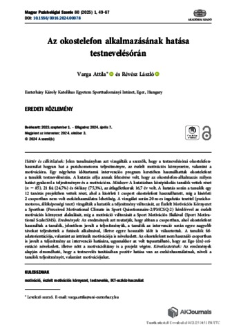 Varga, Attila and Révész, László (2025) Az okostelefon alkalmazásának hatása testnevelésórán. MAGYAR PSZICHOLÓGIAI SZEMLE, 80 (1). pp. 49-67. ISSN 0025-0279