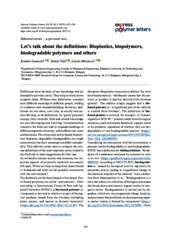 Litauszki, Katalin and Tábi, Tamás and Mészáros, László (2025) Let's talk about the definitions: Bioplastics, biopolymers, biodegradable polymers and others. EXPRESS POLYMER LETTERS, 19 (5). pp. 455-456. ISSN 1788618X