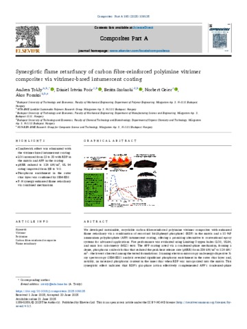 Toldy, Andrea and Poór, Dániel István and Szolnoki, Beáta and Geier, Norbert and Pomázi, Ákos (2025) Synergistic flame retardancy of carbon fibre-reinforced polyimine vitrimer composites via vitrimer-based intumescent coating. COMPOSITES PART A: APPLIED SCIENCE AND MANUFACTURING, 198. No.-109135. ISSN 1359-835X