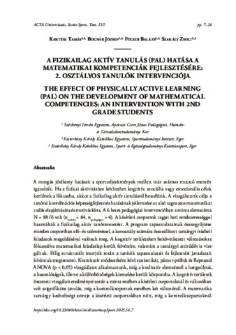 Kertész, Tamás and Bognár, József and Fügedi, Balázs and Szakály, Zsolt (2025) A fizikailag aktív tanulás (PAL) hatása a matematikai kompetenciák fejlesztésére: 2. Osztályos tanulók intervenciója = The effect of physically active learning (pal) on the development of mathematical competencies: an intervention with 2nd grade students. ACTA UNIVERSITATIS DE CAROLO ESZTERHÁZY NOMINATAE. SECTIO SPORT, 56. pp. 7-24. ISSN 26770105