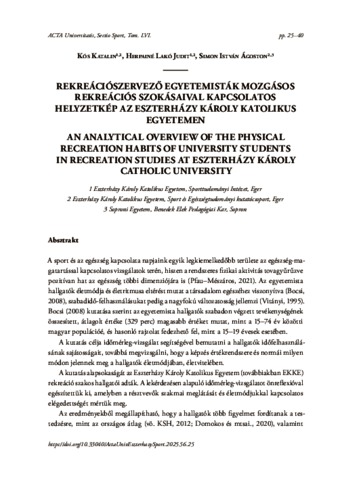 Kós, Katalin and Herpainé Lakó, Judit and Simon, István Ágoston (2025) Rekreációszervező egyetemisták mozgásos rekreációs szokásaival kapcsolatos helyzetkép az Eszterházy Károly Katolikus Egyetemen = An analytical overview of the physical recreation habits of university students in recreation studies at Eszterházy Károly Catholic University. ACTA UNIVERSITATIS DE CAROLO ESZTERHÁZY NOMINATAE. SECTIO SPORT, 56. pp. 25-40. ISSN 26770105