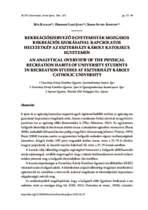 A sport és az egészség kapcsolata napjaink egyik legkiemelkedőbb területe az egészség-magatartással kapcsolatos vizsgálatok terén, hiszen a rendszeres fizikai aktivitás tovagyűrűzve pozitívan hat az egészség többi dimenziójára is (Pfau–Mészáros, 2021). Az egyetemista hallgatók életmódja és életritmusa eltérést mutat a társadalom egészéhez viszonyítva (Bocsi, 2008), szabadidő-felhasználásukat pedig a nagyfokú változatosság jellemzi (Vitányi, 1995). Bocsi (2008) kutatása szerint az egyetemista hallgatók szabadon végzett tevékenységének összesített, átlagolt értéke (329 perc) magasabb értéket mutat, mint a 15–74 év közötti magyar populációé, és hasonló rajzolat fedezhető fel, mint a 15–19 évesek esetében. A kutatás célja időmérleg-vizsgálat segítségével bemutatni a hallgatók időfelhasználásának sajátosságait, továbbá megvizsgálni, hogy a képzés értékrendszere és normái milyen módon jelennek meg a hallgatók életmódjában, életvitelében. A kutatás alapsokaságát az Eszterházy Károly Katolikus Egyetem (továbbiakban EKKE) rekreáció szakos hallgatói adták. A lekérdezésen alapuló időmérleg-vizsgálatot önreflexióval egészítettük ki, amelyben a résztvevők szakmai meglátását és életmódjukkal kapcsolatos elégedettségét mértük meg. Az eredményekből megállapítható, hogy a hallgatók több figyelmet fordítanak a testedzésre, mint az országos átlag (vö. KSH, 2012; Domokos és mtsai., 2020), valamint jobb szubjektív életminőségről számolnak be. Többségük (n = 51 fő) elégedett, és nem változtatna jelenlegi életmódján. A harmadéves hallgatóknak jelentősen több a társadalmilag kötött idejük, melyben fontos szerepet tölt be a munkavégzésre fordított időkeret. A másodévesek átlagosan 6 órával több időt fordítanak egyetemen kívüli tanfolyamok elvégzésével, és mintegy 4,5 órával kevesebbet passzív szabadidős tevékenységek végzésével. Jelentős eltérések csak a nappali és levelező tagozat között fedezhetők fel a társadalmilag kötött idő tekintetében, mivel a másodéves levelező tagozatosok csaknem átlagosan 20 órával több munkát vállalnak, mint a nappalisok, míg ez az arány harmadévre már felére csökken. | The connection between sports and health is one of the most prominent areas in health behavior research today, as regular physical activity has a ripple effect, positively influencing other dimensions of health (Pfau & Mészáros, 2021). University students’ lifestyles and daily rhythms differ significantly from those of the general population (Bocsi, 2008), and their leisure time usage is characterized by a high degree of variability (Vitányi, 1995). According to Bocsi’s (2008) research, the total average time spent on freely chosen activities by university students (329 minutes) is higher than that of the Hungarian population aged 15-74 and follows a pattern similar to that observed in the 15-19 age group. The aim of this research is to examine the specificities of students’ time allocation through a time-budget study and to explore how the values and norms of their academic training manifest in their lifestyle and daily routines. The study is based on a survey conducted among recreation studies students at Eszterházy Károly Catholic University (hereinafter EKCU) and aims to provide insight into their sports-related habits. The time-budget study was complemented by a self-reflective assessment, in which students’ professional insights and satisfaction with their lifestyle were evaluated. The findings indicate that students devote more attention to physical exercise than the national average (cf. KSH, 2012; Domokos et al., 2020) and report a higher subjective quality of life. The majority (n = 51) expressed satisfaction with their current lifestyle and would not opt for any changes. Third-year students have significantly more socially constrained time, with a notable portion allocated to employment. In contrast, second-year students spend an average of six more hours per week on extracurricular courses and approximately 4.5 fewer hours on passive leisure activities. Significant differences were observed primarily between full-time and part-time students regarding socially constrained time, as second-year part-time students work nearly 20 hours more per week on average than their full-time counterparts. However, by the third year, this discrepancy is reduced by half.