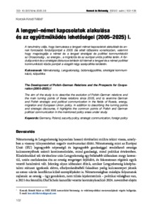 A tanulmány célja, hogy bemutassa a lengyel–német kapcsolatok alakulását és annak fontosabb fordulópontjait a 2005 óta eltelt időszakra vonatkozóan, valamint hogy megvizsgálja a német és a lengyel stratégiai és politikai kommunikációt az Oroszország-, az energia-, a migrációs és az európai uniós politika terén. A fordulópontok és a stratégiai diskurzus leírásán túl kiemeli a lengyel és a német politikai kommunikáció közös pontjait a vizsgált négy szakpolitika területén. | The aim of the study is to describe the evolution of Polish–German relations and the main turning points of these relations since 2005, and to examine German and Polish strategic and political communication in the fields of Russia, energy, migration and European Union policy. In addition to describing the turning points and strategic discourse, it highlights the common points of Polish and German political communication in the mentioned policy areas under study.