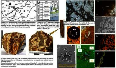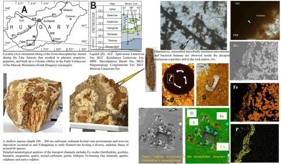 Continental rifting of the Tisza microplate started during the Late Jurassic and resulted in phreatic eruptions, peperite, and the construction of a volcanic edifice in the Early Cretaceous in the Mecsek Mountains (South Hungary). In the SE direction from the volcanic edifice at Zengővárkony, a shallow marine (depth 100–200 m) carbonate sediment hosted a vent environment, and iron ore deposition occurred at the end of the Valanginian to early Hauterivian, hosting a diverse, endemic fauna of approximately 60 species. The detailed mineralogical analysis of the transport conduits included Fe oxides (ferrihydrite, goethite, hematite, and magnetite), quartz, mixed carbonate, pyrite, feldspar, Fe-bearing clay minerals, apatite, sulfates (barite, gypsum, and jarosite), and native sulfur. Filamentous, microbially mediated microtextures with inner sequented, necklace-like spheric forms (diameter of 1 μm) and bacterial laminae are also observed inside decapod crustacean coprolites (Palaxius tetraochetarius) and in the rock matrix. This complex ecological and mineralogical analysis provided direct evidence for the presence of bacteria in fossil sediment-hosted vent (SHV) environments on the one hand and for the intimate connection between bacteria and decapod crustaceans in hydrothermal environments 135 Ma before. This observation completes the fossil food chain of chemosynthesis-based ecosystems, from primary producers to the top carnivores reported for the first time from this locality.
