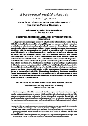 A fogyasztók számára egyre nehezebb a tájékozódás a borválasztás terén. A megkülönböztetés, hitelesítés eszköze lehet például egy borversenyen elért jó eredmény, ezért érdemes a borászatoknak megfontolniuk a nevezést. A tanulmány célja, hogy megvizsgálja a borversenyek megbízhatóságát és jelentőségét marketingszempontból, illetve a bírálat azon aspektusait, amelyek fontosak lehetnek a fogyasztók és a termelők számára. A szakirodalom mellett a tanulmány a Winelovers Wine Awards két évének bírálati részpontszámaira épül. 2022-ben több mint 600 bort értékelt 58 zsűritag, míg 2023-ban 65 zsűritag bírált több mint 800 tételt. Az adatok elemzése statisztikai eszközökkel történt, a leíró statisztikai mutatószámok mellett a pontszámokat feltételezhetően befolyásoló tényezők hatásait is vizsgáltuk a sztochasztikus kapcsolatok indikátoraival. Az elemzés azt mutatja, hogy a zsűritagok megbízhatóan értékeltek a versenyen, és nincs eltérés a különböző bírálók (szakértők, kereskedők, borászok) teljesítménye között. Az egyes borfajták azonban máshogy szerepelnek a megmérettetésen, a legnagyobb szórást az édes borok mutatták a pontszámokat tekintve. A fogyasztóknak vásárlási döntéseik során érdemes figyelembe venniük a (neves) borversenyek eredményeit, és a termelők számára is hasznos a nevezés, mert szakértői visszajelzést kaphatnak termékeikről, valamint kommunikációjuk során felhasználhatják az eredményeket. | It is becoming more difficult for consumers to find their way around when choosing wine. A good result at a wine competition can be a means of differentiation and authentication, so it is worth for wineries considering entering such events. The aim of the study is to examine the reliability and significance of wine competitions from a marketing point of view, as well as the aspects of judging that may be important for consumers and producers. In addition to the literature, the study is based on the evaluation scores from two years of the Winelovers Wine Awards. In 2022, more than 600 wines were evaluated by 58 judges, while in 2023, 65 judges assessed more than 800 entries. The data was analyzed using statistical tools, in addition to descriptive statistical indicators, we also examined the effects of factors presumably influencing the scores by using indicators of stochastic relationships. The analysis shows that the jury members were reliable in their evaluations at the competition, and there is no difference between the performances of the different types of judges (experts, merchants, winemakers). However, each type of wine scored differently in the competition, sweet wines showed the greatest variance in terms of scores. Consumers should consider the results of (famous) wine competitions when making their purchasing decisions. Participation in these competitions is also useful for producers, as they can receive expert feedback on their products and use the results in their communication.