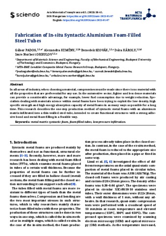 Pados, Gábor and Kemény, Alexandra and Szovák, Benedek and Károly, Dóra and Orbulov, Imre Norbert (2023) Fabrication of In-situ Syntactic Aluminium Foam-Filled Steel Tubes. ACTA MATERIALIA TRANSYLVANICA (EN), 6 (1). pp. 38-41. ISSN 2601-8799
