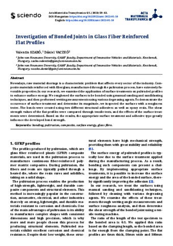 Szabó, Valentin Endre and Vaczkó, Dániel (2023) Investigation of bonded joints in glass fiber reinforced flat profiles. ACTA MATERIALIA TRANSYLVANICA (EN), 6 (1). pp. 59-63. ISSN 2601-8799