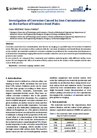 Breznay, Csaba and Varbai, Balázs (2023) Investigation of Corrosion Caused by Iron Contamination on the Surface of Stainless Steel Plates. ACTA MATERIALIA TRANSYLVANICA (EN), 6 (1). pp. 9-13. ISSN 2601-8799