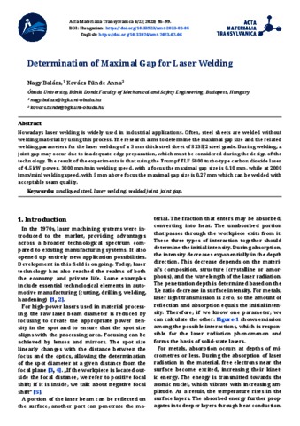 Nagy, Balázs and Kovács, Tünde Anna (2023) Determination of Maximal Gap for Laser Welding. ACTA MATERIALIA TRANSYLVANICA (EN), 6 (2). pp. 95-99. ISSN 2601-8799