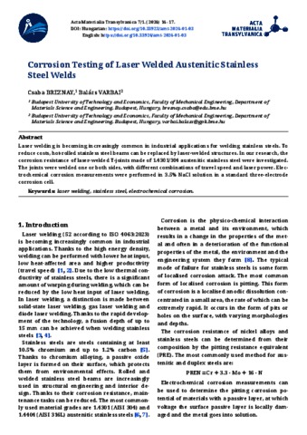 Breznay, Csaba and Varbai, Balázs (2024) Corrosion Testing of Laser Welded Austenitic Stainless Steel Welds. ACTA MATERIALIA TRANSYLVANICA (EN), 7 (1). pp. 14-17. ISSN 2601-8799
