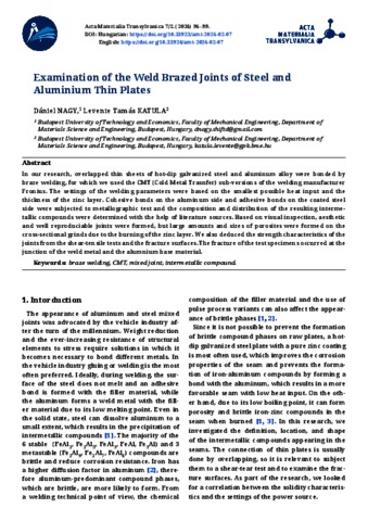 In our research, overlapped thin sheets of hot-dip galvanized steel and aluminum alloy were bonded bybraze welding, for which we used the CMT (Cold Metal Trasnfer) sub-versions of the welding manufacturerFronius. The settings of the welding parameters were based on the smallest possible heat input and thethickness of the zinc layer. Cohesive bonds on the aluminum side and adhesive bonds on the coated steelside were subjected to metallographic test and the composition and distribution of the resulting intermetallic compounds were determined with the help of literature sources. Based on visual inspection, aestheticand well reproduciable joints were formed, but large amounts and sizes of porosites were formed on thecross-sectional grinds due to the burning of the zinc layer. We also deduced the strength characteristics of thejoints from the shear-tensile tests and the fracture surfaces. The fracture of the test specimens occurred at thejunction of the weld metal and the alumnium base material.
