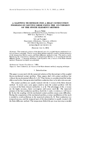 Pere, Balázs and Páczelt, István (2002) A mapping technique for a heat conduction problem on moving mesh using the hp-version of the finite element method. JOURNAL OF COMPUTATIONAL AND APPLIED MECHANICS, 3 (2). pp. 169-191. ISSN 1586-2070