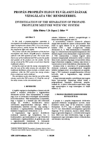 Kállai, Viktória and Szepesi L., Gábor (2024) Propán-propilén elegy elválasztásának vizsgálata VRC rendszerrel. GÉP, 75 (1). pp. 31-34. ISSN 0016-8572