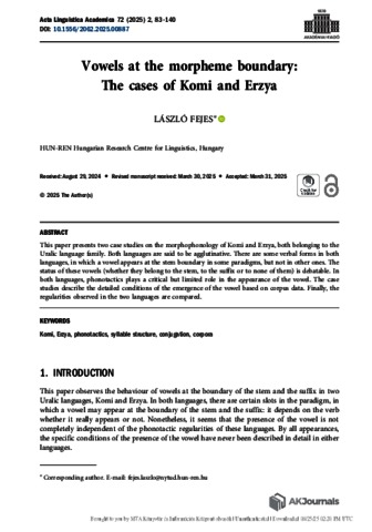 Fejes, László (2025) Vowels at the morpheme boundary: The cases of Komi and Erzya. ACTA LINGUISTICA ACADEMICA, 72 (2). pp. 83-140. ISSN 2559-8201