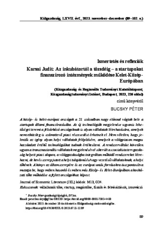 Bucsky, Péter (2023) Ismertetés és reflexiók Karsai Judit: Az inkubátortól a tőzsdéig – a startupokat finanszírozó intézmények működése Kelet-Közép-Európában (Közgazdaság- és Regionális Tudományi Kutatóközpont, Közgazdaságtudományi Intézet, Budapest, 2023, 226 oldal) című könyvéről. KÜLGAZDASÁG, 67 (11-12). pp. 89-102. ISSN 0324-4202 (print), 2732-0235 (online)