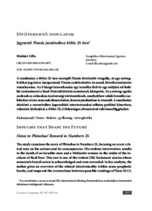 A tanulmány a 4Móz 25-ben szereplő Fineás történetét vizsgálja, és egy szövegkritikai jegyzetre összpontosít Fineás cselekedetére és annak következményeire vonatkozóan. Az ő buzgó beavatkozása egy izraelita férfi és egy midjáni nő halálát eredményezi a Baal-Peórnál történt események közepette. Ez a szöveg egyike azoknak az erőszakos ószövetségi történeteknek, amelyekben valaki brutális cselekedete révén nemcsak elismerésben, hanem jutalomban is részesül. A tanulmány áttekinti a narratívához kapcsolódó intertextusokat néhány prófétai könyvben, valamint körbejárja a 4Móz 25,12 lehetséges olvasataival való összefüggéseket. | The study examines the story of Phinehas in Numbers 25, focusing on a text-critical note on his actions and its consequences. His zealous intervention results in the death of an Israelite man and a Midianite woman in the midst of the incident of Baal Peor. This text is one of the violent Old Testament stories where someone’s brutal action is acknowledged and even rewarded. In her analysis, the author gives an overview of the related intertextuality within some prophetic books, and maps out the connections between possible readings of Num 25:12.