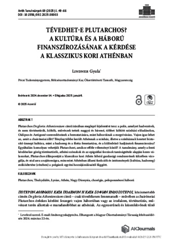 Lindner, Gyula (2025) Tévedhet-e Plutarchos? A kultúra és a háború finanszírozásának a kérdése a klasszikus kori Athénban. ANTIK TANULMÁNYOK - STUDIA ANTIQUA, 69 (1). pp. 49-66. ISSN 0003-567X