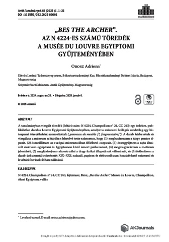 Orosz, Adrienn (2025) „Bes the Archer”. Az N 4224-es számú töredék a Musée du Louvre Egyiptomi Gyűjteményében. ANTIK TANULMÁNYOK - STUDIA ANTIQUA, 69 (1). pp. 1-26. ISSN 0003-567X