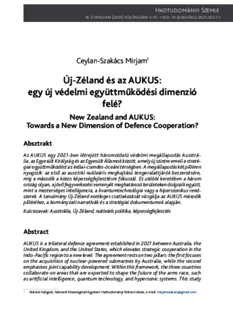 Az AUKUS egy 2021-ben létrejött háromoldalú védelmi megállapodás Ausztrália, az Egyesült Királyság és az Egyesült Államok között, amely új szintre emeli a stratégiai együttműködést az indiai-csendes-óceáni térségben. A megállapodás két pilléren nyugszik: az első az ausztrál nukleáris meghajtású tengeralattjárók beszerzésére, míg a második a közös képességfejlesztésre fókuszál. Ez utóbbi keretében a három ország olyan, a jövő fegyverkezési versenyét meghatározó területeken dolgozik együtt, mint a mesterséges intelligencia, a kvantumtechnológia vagy a hiperszonikus rendszerek. A tanulmány Új-Zéland esetleges csatlakozását vizsgálja az AUKUS második pilléréhez, a kormányzati narratívák és a stratégiai dokumentumok alapján. | AUKUS is a trilateral defence agreement established in 2021 between Australia, the United Kingdom, and the United States, which elevates strategic cooperation in the Indo-Pacific region to a new level. The agreement rests on two pillars: the first focuses on the acquisition of nuclear-powered submarines by Australia, while the second emphasises joint capability development. Within this framework, the three countries collaborate on areas that are expected to shape the future of the arms race, such as artificial intelligence, quantum technology, and hypersonic systems. This study examines New Zealand’s potential accession to the second pillar of AUKUS, based on government narratives and key strategic documents.