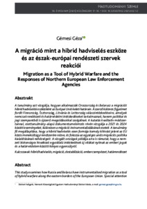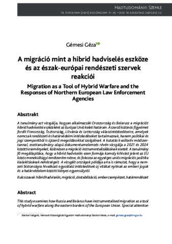 A tanulmány azt vizsgálja, hogyan alkalmazzák Oroszország és Belarusz a migrációt hibrid hadviselési eszközként az Európai Unió keleti határain. A szerző különös figyelmet fordít Finnország, Észtország, Litvánia és Lettország válaszintézkedéseire, amelyek nemcsak rendészeti és határvédelmi intézkedéseket tartalmaznak, hanem politikai és jogi szempontból is újszerű megoldásokkal szolgálnak. A kutatás kvalitatív módszertannal, esettanulmány-alapú dokumentumelemzés révén vizsgálja a 2021 és 2024 közötti eseményeket, különösen a migráció instrumentalizálásának eseteit. A tanulmány fő megállapítása, hogy a hibrid hadviselés ezen formája komoly kihívást jelent az EU közös menekültügyi rendszerére nézve, és fokozza az egységes uniós migrációs politika kialakításának nehézségeit. A vizsgált országok példája arra is rámutat, hogy a nemzeti biztonságra hivatkozó egyoldalú intézkedések új vitákat nyitnak az emberi jogok és a határvédelem közötti kényes egyensúlyról. | This study examines how Russia and Belarus have instrumentalised migration as a tool of hybrid warfare along the eastern borders of the European Union. Special attention is given to the responses of Finland, Lithuania, and Latvia, which include not only law enforcement and border protection measures but also innovative political and legal solutions. Using a qualitative, case study-based document analysis, the research focuses on developments between 2021 and 2024, particularly on instances of migration being used as a means of coercion. The main finding is that this form of hybrid warfare poses significant challenges to the EU’s common asylum system and exacerbates the difficulties in forming a unified migration policy. The cases analysed further illustrate that unilateral actions justified by national security concerns open new debates about the fragile balance between border protection and human rights.