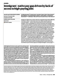 Immigrants to high-income countries often face considerable and persistent difficulties in the labour market, whereas their native-born children typically experience economic progress. However, little is known about the extent to which these immigrant–native earnings differences stem from unequal pay when doing the same work for the same employer versus labour market processes that sort immigrants into lower-paid jobs. Here, using data from nine European and North American countries, we show that the segregation of workers with immigrant backgrounds into lower-paying jobs accounts for about three-quarters of overall immigrant–native earnings differences. Although within-job pay inequality remains notable for immigrants in several countries, our results demonstrate that unequal access to higher-paying jobs is the primary driver of the immigrant–native pay gap across a range of institutionally and demographically diverse contexts. These findings highlight the importance of policies aimed at reducing between-job segregation, such as language training, job training, job search assistance programmes, improving access to domestic education, recognizing foreign qualifications, and settlement programmes aimed at enhancing access to job-relevant information and networks. Policies that target employer bias in hiring and promotion decisions are also likely to be effective, whereas measures aimed at ensuring equal pay for equal work may have more limited scope for further progress in closing the immigrant–native pay gap