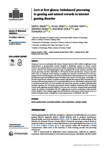 Zhou, Xinyu and Zeng, Yuan and Wen, Yatong and Dong, Xinwen and Gola, Mateusz and Li, Yonghui (2025) Love at first glance: Imbalanced processing to gaming and natural rewards in internet gaming disorder. JOURNAL OF BEHAVIORAL ADDICTIONS, 14 (2). pp. 805-816. ISSN 2062-5871