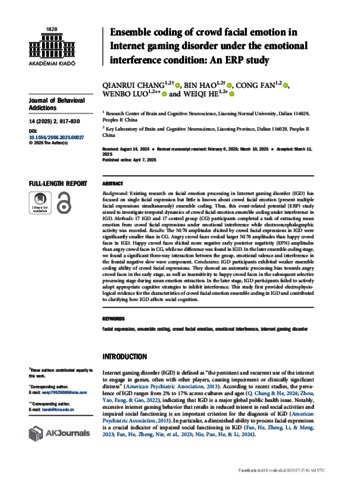 Chang, Qianrui and Hao, Bin and Fan, Cong and Luo, Wenbo and He, Weiqi (2025) Ensemble coding of crowd facial emotion in Internet gaming disorder under the emotional interference condition: An ERP study. JOURNAL OF BEHAVIORAL ADDICTIONS, 14 (2). pp. 817-830. ISSN 2062-5871