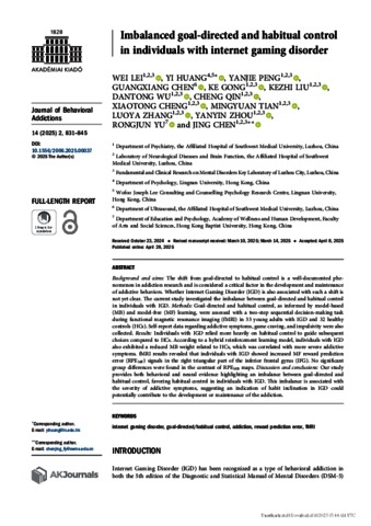 Lei, Wei and Huang, Yi and Peng, Yanjie and Chen, Guangxiang and Gong, Ke and Liu, Kezhi and Wu, Dantong and Qin, Cheng and Cheng, Xiaotong and Tian, Mingyuan and Zhang, Luoya and Zhou, Yanyin and Yu, Rongjun and Chen, Jing (2025) Imbalanced goal-directed and habitual control in individuals with internet gaming disorder. JOURNAL OF BEHAVIORAL ADDICTIONS, 14 (2). pp. 831-845. ISSN 2062-5871