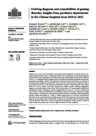 Wang, Xuhao and Lin, Shuhong and Liu, Xuebing and Huang, Shucai and Qi, Jing and Shao, Tianli and Liao, Zhenjiang and Chen, Xinxin and Li, Yifan and Tang, Ying and Shen, Hongxian and Huang, Qiuping (2025) Evolving diagnosis and comorbidities of gaming disorder: Insights from psychiatry departments in five Chinese hospitals from 2018 to 2023. JOURNAL OF BEHAVIORAL ADDICTIONS, 14 (2). pp. 873-888. ISSN 2062-5871