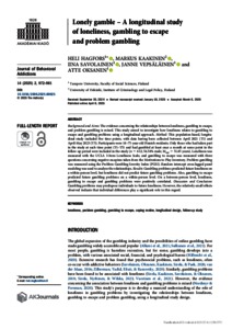 Hagfors, Heli and Kaakinen, Markus and Savolainen, Iina and Vepsäläinen, Janne and Oksanen, Atte (2025) Lonely gamble : A longitudinal study of loneliness, gambling to escape and problem gambling. JOURNAL OF BEHAVIORAL ADDICTIONS, 14 (2). pp. 972-981. ISSN 2062-5871