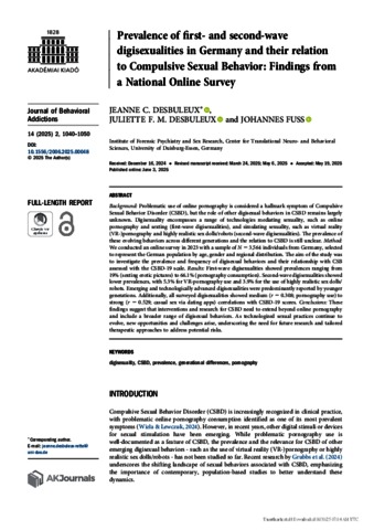 Desbuleux, Jeanne C. and Desbuleux, Juliette F. M. and Fuss, Johannes (2025) Prevalence of first- and second-wave digisexualities in Germany and their relation to Compulsive Sexual Behavior: Findings from a National Online Survey. JOURNAL OF BEHAVIORAL ADDICTIONS, 14 (2). pp. 1040-1050. ISSN 2062-5871