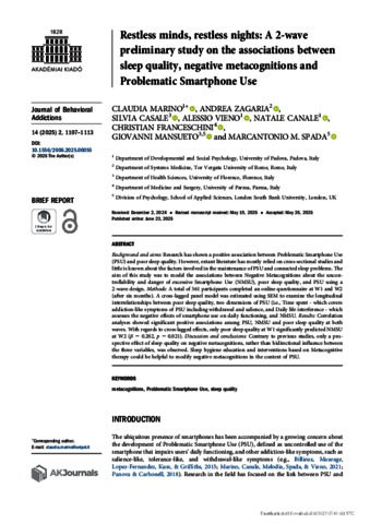 Marino, Claudia and Zagaria, Andrea and Casale, Silvia and Vieno, Alessio and Canale, Natale and Franceschini, Christian and Mansueto, Giovanni and Spada, Marcantonio M. (2025) Restless minds, restless nights: A 2-wave preliminary study on the associations between sleep quality, negative metacognitions and Problematic Smartphone Use. JOURNAL OF BEHAVIORAL ADDICTIONS, 14 (2). pp. 1107-1113. ISSN 2062-5871