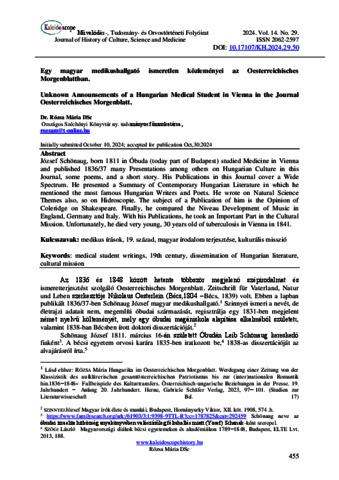 Rózsa, Mária (2024) Egy magyar medikushallgató ismeretlen közleményei az Oesterreichisches Morgenblattban. KALEIDOSCOPE: MŰVELŐDÉS- TUDOMÁNY- ÉS ORVOSTÖRTÉNETI FOLYÓIRAT, 14 (29). pp. 455-460. ISSN 2062-2597