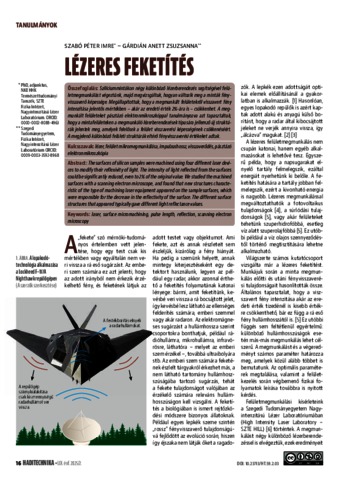Szilícium mintákon négy különböző lézerberendezés segítségével felületmegmunkálást végeztünk, majd megvizsgáltuk, hogyan változik meg a minták fényvisszaverő képessége. Megállapítottuk, hogy a megmunkált felületekről visszavert fény intenzitása jelentős mértékben - akár az eredeti érték 2%-ára is - csökkenhet. A megmunkált felületeket pásztázó elektronmikroszkóppal tanulmányozva azt tapasztaltuk, hogy a mintafelületeken a megmunkáló lézerberendezések típusára jellemző új struktúrák jelentek meg, amelyek felelősek a felület visszaverési képességének csökkenéséért. A megjelenő különböző felületi struktúrák eltérő fényvisszaverési értékeket adtak. | The surfaces of silicon samples were machined using four different laser devi-ces to modify their reflexivity of light. The intensity of light reflected from the surfaces could be significantly reduced, even to 2% of the original value. We studied the machined surfaces with a scanning electron microscope, and found that new structures characte-ristic of the type of machining laser equipment appeared on the sample surfaces, which were responsible for the decrease in the reflectivity of the surface. The different surface structures that appeared typically gave different light reflectance values.