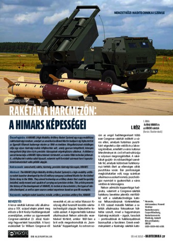 A HIMARS (High Mobility Artillery Rocket System) egy nagy mobilitású rakétatüzérségi rendszer, amelyet az amerikai Lockheed Martin hadipari cég fejlesztett ki az Egyesült Államok hadserege részére az 1990-es években. Megalkotásának elsődleges célja egy olyan tüzérségi eszköz kifejlesztése volt, amely gyorsan telepíthető, könnyen mozgatható (légi úton is) és precíziós tűzcsapások végrehajtására alkalmas. A cikkben a szerző bemutatja a HIMARS fejlesztésének történetét, az eszköz főbb technikai jellemzőit, a kifejlesztett rakétacsalád típusait, valamint nyílt forrásból származó harci tapasztalatok bemutatását valós példák alapján. | The HIMARS (High Mobility Artillery Rocket System) is a high-mobility artille-ry rocket launcher developed by the US military company Lockheed Martin for the United States Army in the 1990s. They aimed to develop an artillery device that could be quickly installed, easily moved and capable of carrying out precision strikes. This article presents the history of the development of HIMARS, its technical characteristics, the types of mis-siles developed, as well as open source combat experience based on specific examples.
