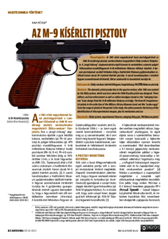 Az 1945 utáni negyedszázad hazai pisztolygyártását az 1948 M rendőrségi pisztoly szerkesztésekor megszületett Elődy-rendszer fémjelezte. A „lengő ütőszeg” alapkonstrukcióra épült katonai és rendvédelmi, valamint polgári felhasználású maroklőfegyverek 9×18 milliméteres Makarov-töltényt tüzeltek. A korszak pisztolyainak sorából feltűnően kilóg a Hadtörténti Múzeum gyűjteményében található három darab M–9 jelzetű kísérleti pisztoly. A szerző tanulmányában a kísérleti fegyver azonosításának történetét, illetve szerkezetét és használatát mutatja be. | The domestic pistol production in the quarter century after 1945 was marked by the Elődy system, which was born when the 1948 M police pistol was designed. These military and law enforcement as well as civilian handguns based on the “swinging ham-mer” basic design fired the 9×18 millimeter Makarov cartridge. The three M-9 experimen-tal pistols in the collection of the Military History Museum stand out like “cuckoo eggs” from the range of pistols of the period. In his study, the author presents the history of the identification of this experimental weapon, plus its mechanism and use.