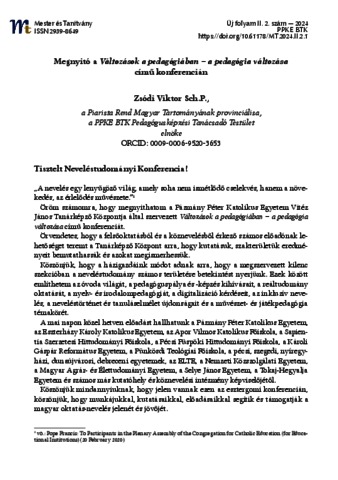 Zsódi, Viktor (2024) Megnyitó a Változások a pedagógiában – a pedagógia változása című konferencián. MESTER ÉS TANÍTVÁNY, 2 (2). pp. 7-9. ISSN 1785-4342 (nyomtatott); 2939-8649 (elektronikus)