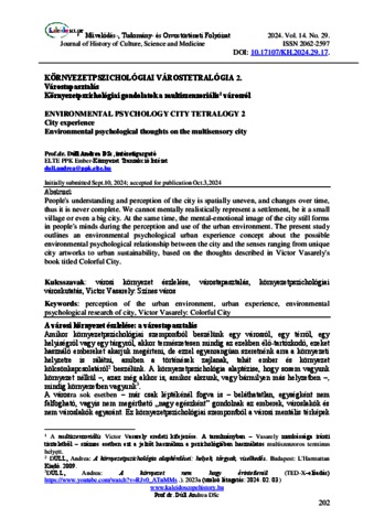Dúll, Andrea (2024) Környezetpszichológiai várostetralógia 2. : Várostapasztalás. Környezetpszichológiai gondolatok a multiszenzoriális városról. KALEIDOSCOPE: MŰVELŐDÉS- TUDOMÁNY- ÉS ORVOSTÖRTÉNETI FOLYÓIRAT, 14 (29). pp. 202-215. ISSN 2062-2597