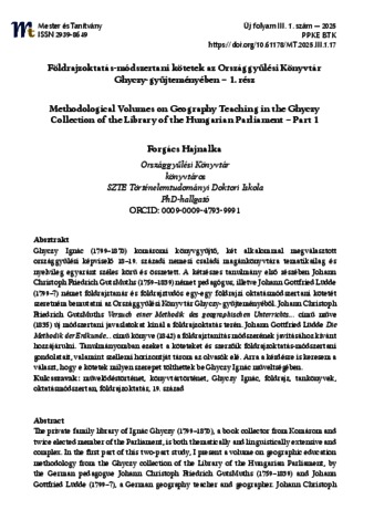 Ghyczy Ignác (1799–1870) komáromi könyvgyűjtő, két alkalommal megválasztott országgyűlési képviselő 18–19. századi nemesi családi magánkönyvtára tematikailag és nyelvileg egyaránt széles körű és összetett. A kétrészes tanulmány első részében Johann Christoph Friedrich GutsMuths (1759–1839) német pedagógus, illetve Johann Gottfried Lüdde (1799–?) német földrajztanár és földrajztudós egy-egy földrajzi oktatásmódszertani kötetét szeretném bemutatni az Országgyűlési Könyvtár Ghyczy gyűjteményéből. Johann Christoph Friedrich GutsMuths Versuch einer Methodik des geographischen Unterrichts… című műve (1835) új módszertani javaslatokat kínál a földrajzoktatás terén. Johann Gottfried Lüdde Die Methodik der Erdkunde… című könyve (1842) a földrajztanítás módszerének javításához kívánt hozzájárulni. Tanulmányomban ezeket a köteteket és szerzőik földrajzoktatás-módszertani gondolatait, valamint szellemi horizontját tárom az olvasók elé. Arra a kérdésre is keresem a választ, hogy e kötetek milyen szerepet tölthettek be Ghyczy Ignác műveltségében.