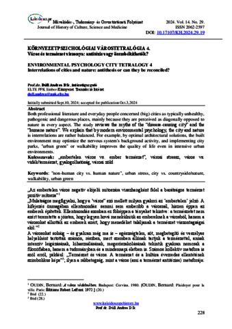 Dúll, Andrea (2024) Környezetpszichológiai várostetralógia 4. : Város és természet viszonya: antitézis vagy összebékíthetők? KALEIDOSCOPE: MŰVELŐDÉS- TUDOMÁNY- ÉS ORVOSTÖRTÉNETI FOLYÓIRAT, 14 (29). pp. 228-242. ISSN 2062-2597