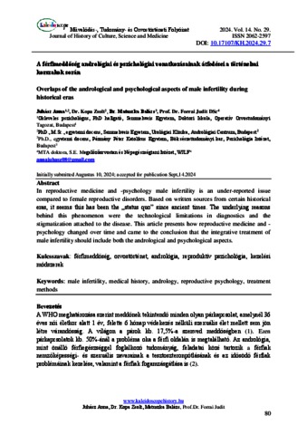 Juhász, Anna and Kopa, Zsolt and Matuszka, Balázs and Forrai, Judit (2024) A férfimeddőség andrológiai és pszichológiai vonatkozásainak átfedései a történelmi korszakok során. KALEIDOSCOPE: MŰVELŐDÉS- TUDOMÁNY- ÉS ORVOSTÖRTÉNETI FOLYÓIRAT, 14 (29). pp. 80-98. ISSN 2062-2597
