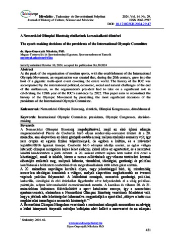 Onyestyák, Nikoletta (2024) A Nemzetközi Olimpiai Bizottság elnökeinek korszakalkotó döntései. KALEIDOSCOPE: MŰVELŐDÉS- TUDOMÁNY- ÉS ORVOSTÖRTÉNETI FOLYÓIRAT, 14 (29). pp. 421-434. ISSN 2062-2597