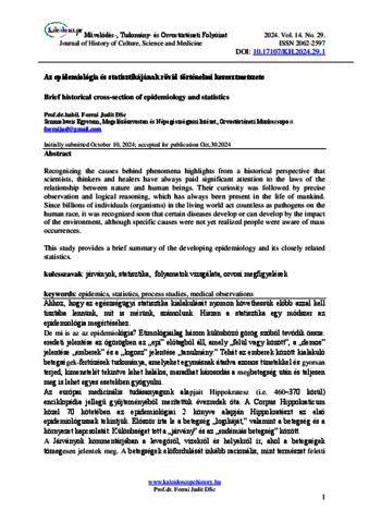Forrai, Judit (2024) Az epidemiológia és statisztikájának rövid történelmi keresztmetszete. KALEIDOSCOPE: MŰVELŐDÉS- TUDOMÁNY- ÉS ORVOSTÖRTÉNETI FOLYÓIRAT, 14 (29). pp. 1-7. ISSN 2062-2597
