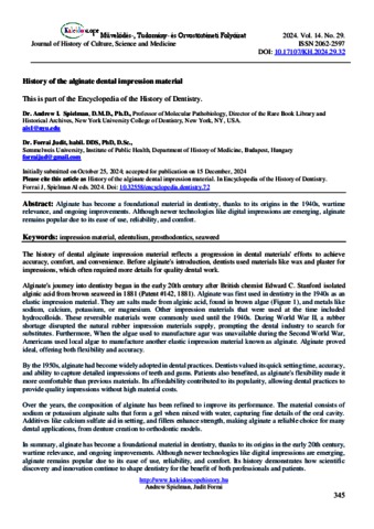 Spielman, Andrew I. and Forrai, Judit (2024) History of the alginate dental impression material. KALEIDOSCOPE: MŰVELŐDÉS- TUDOMÁNY- ÉS ORVOSTÖRTÉNETI FOLYÓIRAT, 14 (29). pp. 345-346. ISSN 2062-2597