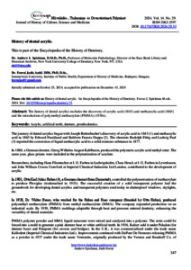 The history of dental acrylics includes the discovery of acrylic acid (1843) and methacrylic acid (1865) and the introduction of polymethyl methacrylate (PMMA) (1930s).