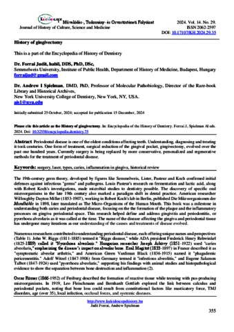 Forrai, Judit and Spielman, Andrew I. (2024) History of gingivectomy. KALEIDOSCOPE: MŰVELŐDÉS- TUDOMÁNY- ÉS ORVOSTÖRTÉNETI FOLYÓIRAT, 14 (29). pp. 355-357. ISSN 2062-2597